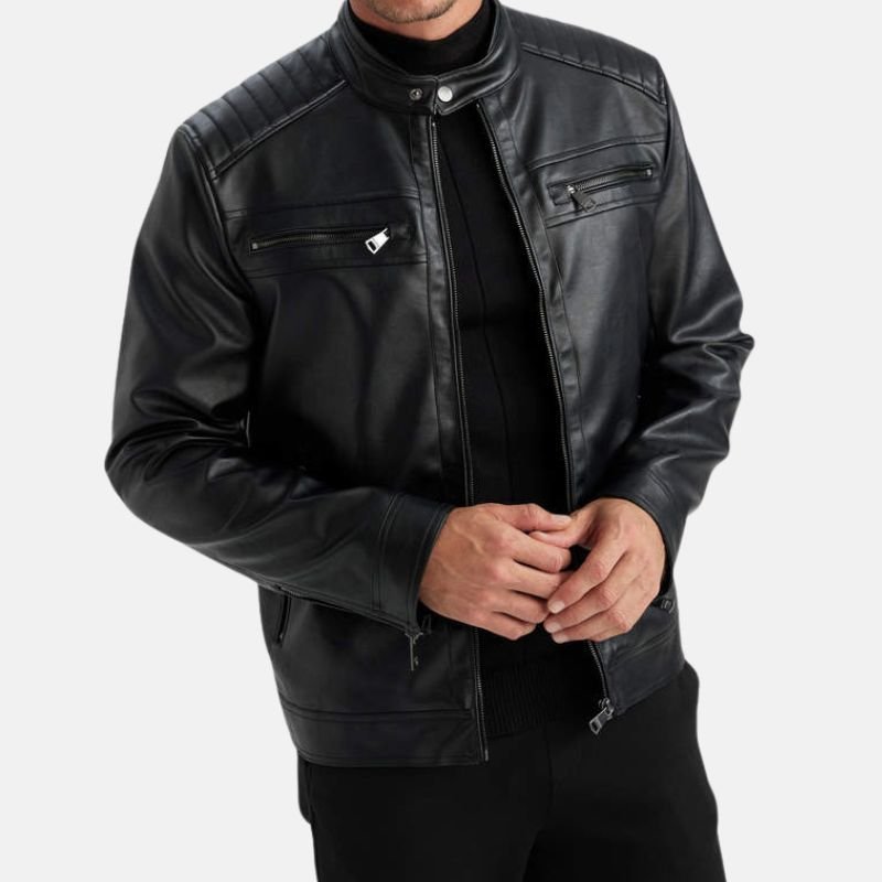 Elevate your wardrobe with this Aiden Men’s Black Leather Cafe Racer Jacket. this Jacket Crafted from premium sheepskin leather in a smooth black finish, it offers both boldness and sophistication. Meanwhile, padded shoulders add texture and dimension, giving classic motorcycle styling a modern twist. The collar with press studs and the strong zip at the front emphasize sharp structure and durability. In addition, four external zipped pockets and one internal pocket provide smart use without sacrificing shape. Whether you wear it with jeans for a casual weekend or trousers for a night out, it easily adapts to your look.