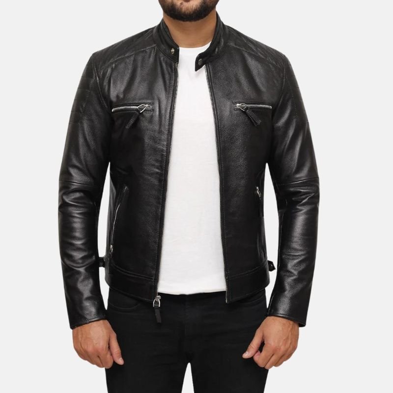 Upgrade your wardrobe with the Liam Quilted Café Racer Black Leather Jacket for Men. Crafted from premium genuine leather, it offers a sharp silhouette that blends a modern look with a classic attitude. The deep black finish matches effortlessly with jeans, chinos or tailored trousers. Meanwhile, the quilted shoulder detail adds texture and subtle character. In addition, the collar with press studs and front zipper reinforces a smooth profile and durable construction. With four external zipped pockets and one internal compartment, this jacket offers smart functionality without compromising on style. This garment is just as suitable for daytime errands as it is for a night out, and seamlessly straddles the line between casual and sophisticated looks.