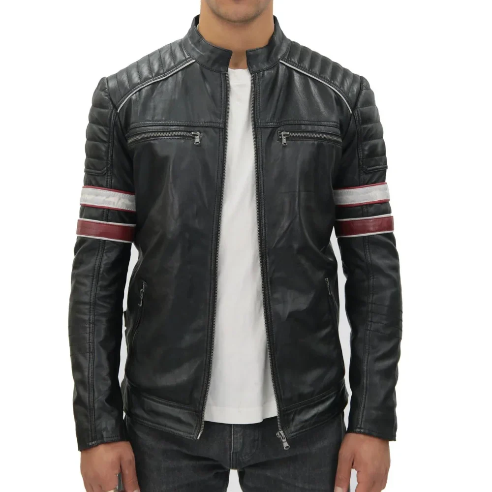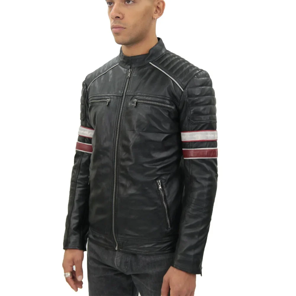 You can appreciate the sophistication of motorsport with the Madrid Men’s Black and Red Quilted Leather Racing Jacket. With White and Red Stripes On Sleeves. It pays homage to the 1950s Le Mans motorsport legends. This quilted racing jacket is made from buttery soft premium lambskin leather. It is sporty and durable enough to withstand everyday use. It is made for gentlemen looking to make a bold statement. The jacket’s racing inspiration is emphasized by the contrasting black and red colors and the white piping. The jacket’s nostalgic racing character is further accentuated with vintage quilted detailing on the shoulders and cuffs. Designed to be easy to wear, the short stand collar and smooth poplin lining are for maximum comfort.