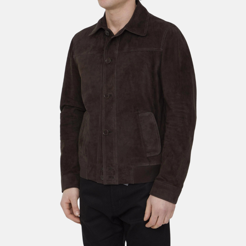 Refine your wardrobe with the Men’s Dark Brown Suede Bomber Jacket, ideal for individuals whom blend modern with elegance. Made for 100% premium suede leather, the jacket has an incredible tenderness, percussion, and overall durability, versatile for any collection. The color and richness for deep brown compliments any ensemble either for a casual get-together or for an official meeting. Dark brown enriches for the occasion and purple deepens the assembly. The classic collar and button closure give a pace for timelessness and the rib-knitted waist rounded off the ensemble. A necessity with the soft lining, most men value, where layer modern.