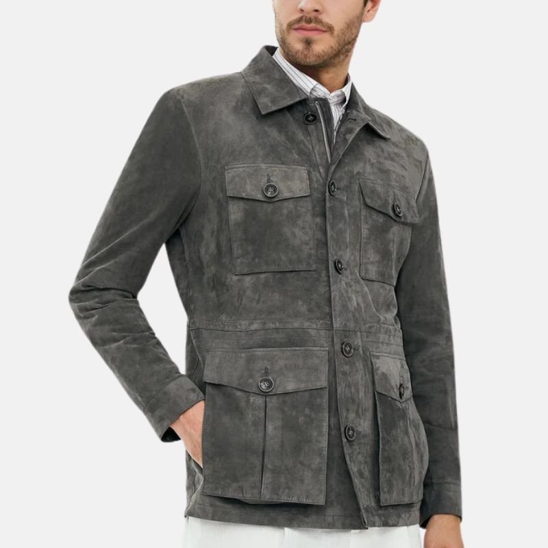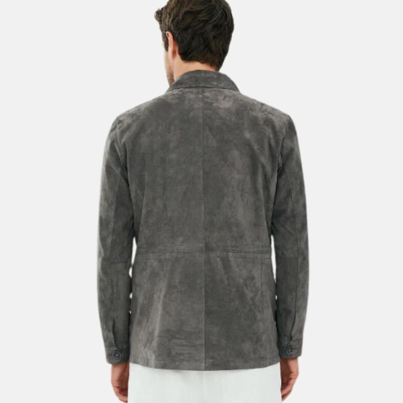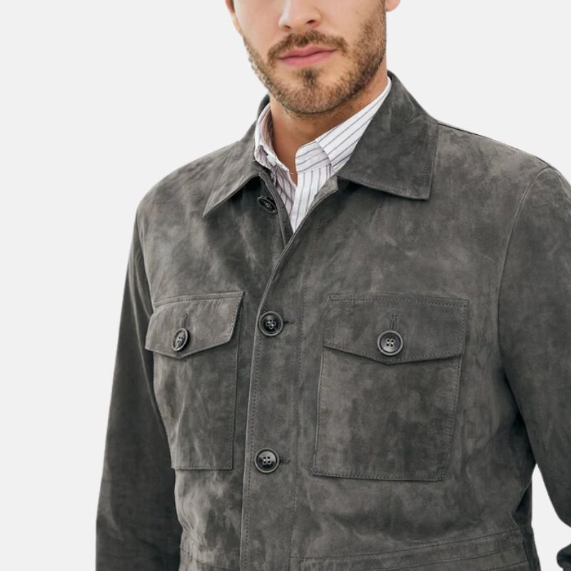 Carefully considered elements improve both utility and aesthetics. A tidy, orderly look is achieved with the fastening elements at the front and cuffs, and the two front pockets maintain discretion and elegance while offering easy access. For additional versatility, the classic collar is easy to dress down or up. This Dark Grey Suede Shirt Jacket is made for modern men who appreciate the combination of style, comfort, and construction. It is made of quality materials and is designed modernly to represent contemporary masculinity. This is an essential piece for anyone looking for functional modern outerwear with a classic look.