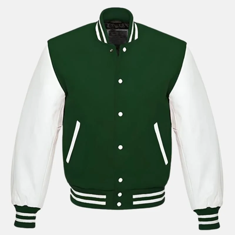 This men’s green and white varsity jacket combines a wool body with genuine leather sleeves. It features a rib-knitted collar, cuffs, and waistband that help maintain its shape. The jacket includes two exterior pockets and one interior pocket, along with a front button closure for practical use.