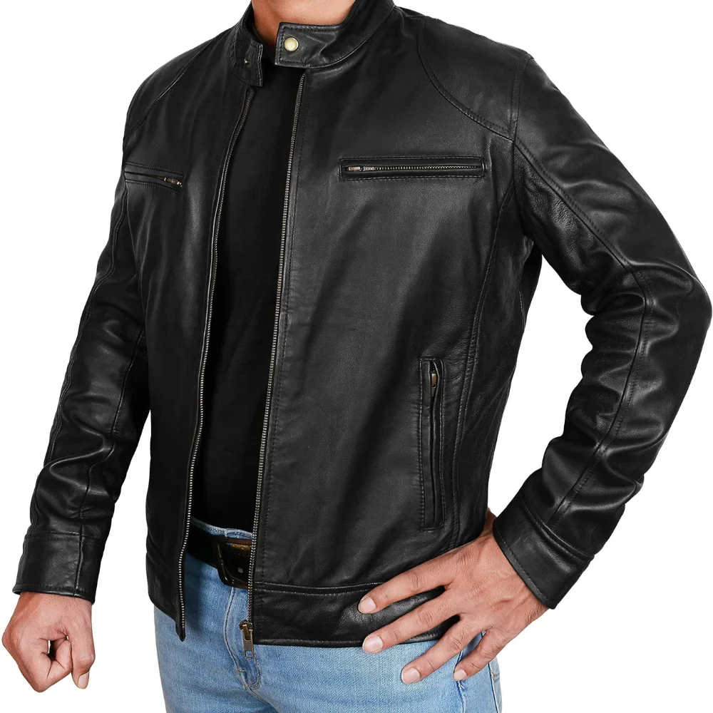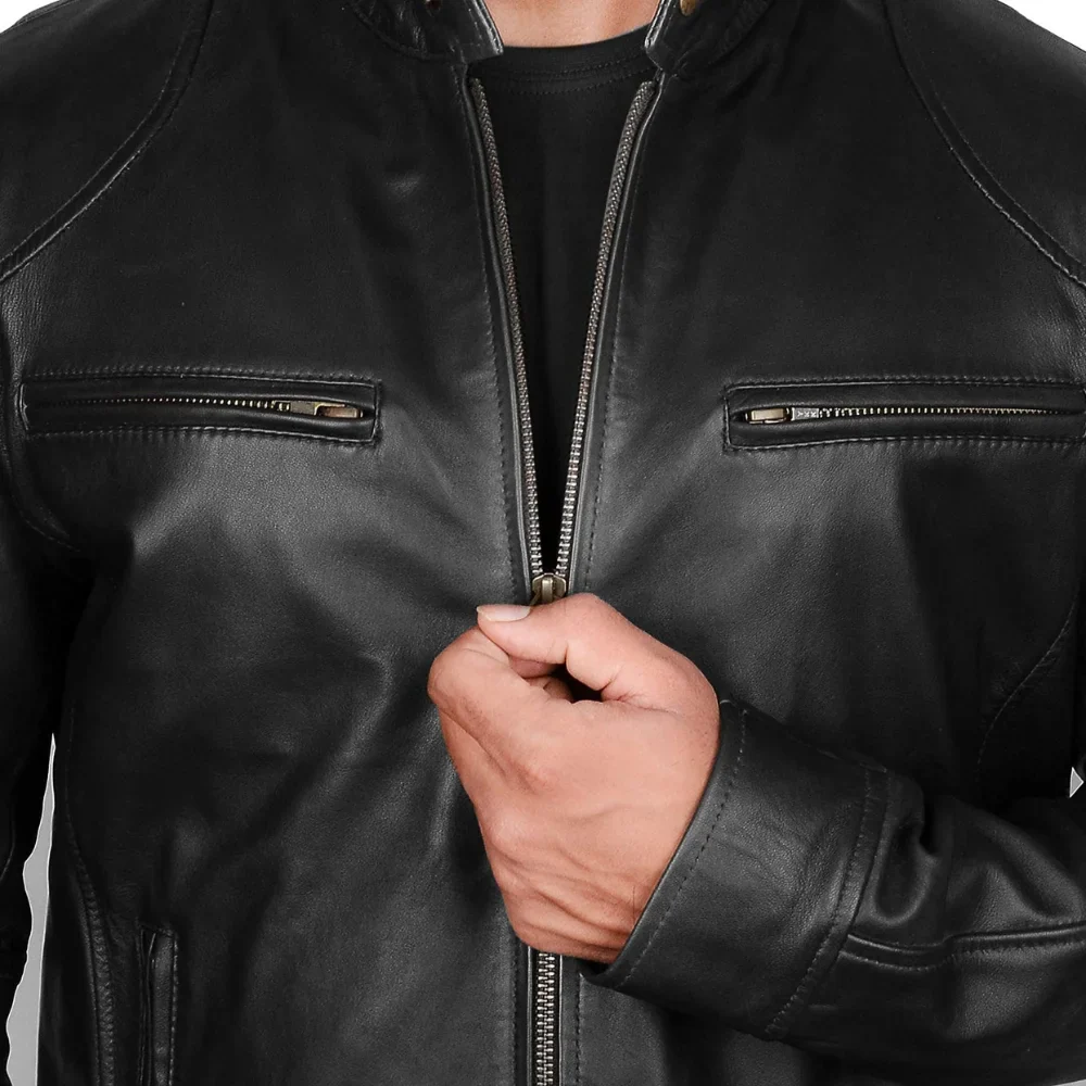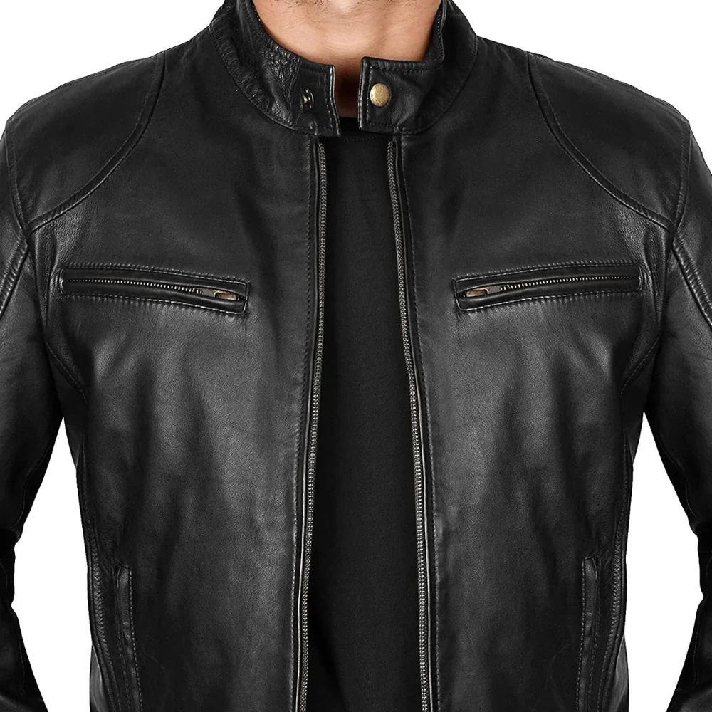 This jacket features two exterior and two interior pockets, as well as an extra pocket for your phone. Modest, yet eye-catching, design provides the versatility for casual outings, rides, or evening events. In addition to modern features, the jacket still embodies the essence of classic biker wear. The Men’s Black Lambskin Leather Cafe Racer Jacket is male outerwear for any man who appreciates the combination of utility and fashion. Ethically sourced, adjustable, and multifunctional, this jacket will surely make you look good while maintaining your ease and self-assurance in any situation.