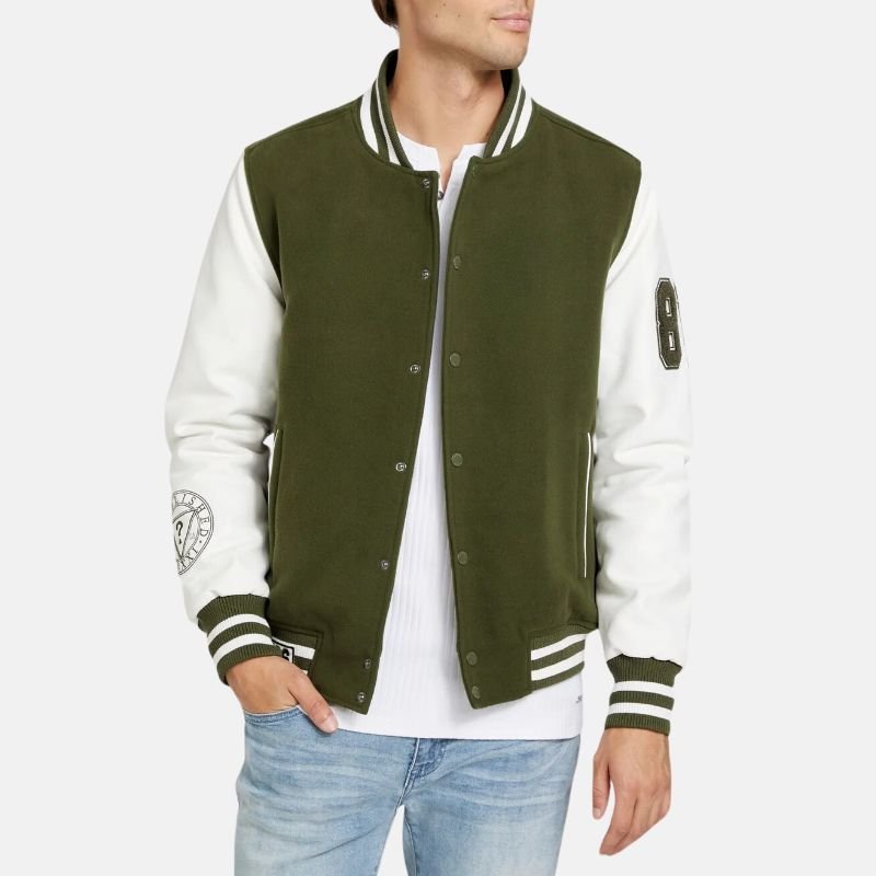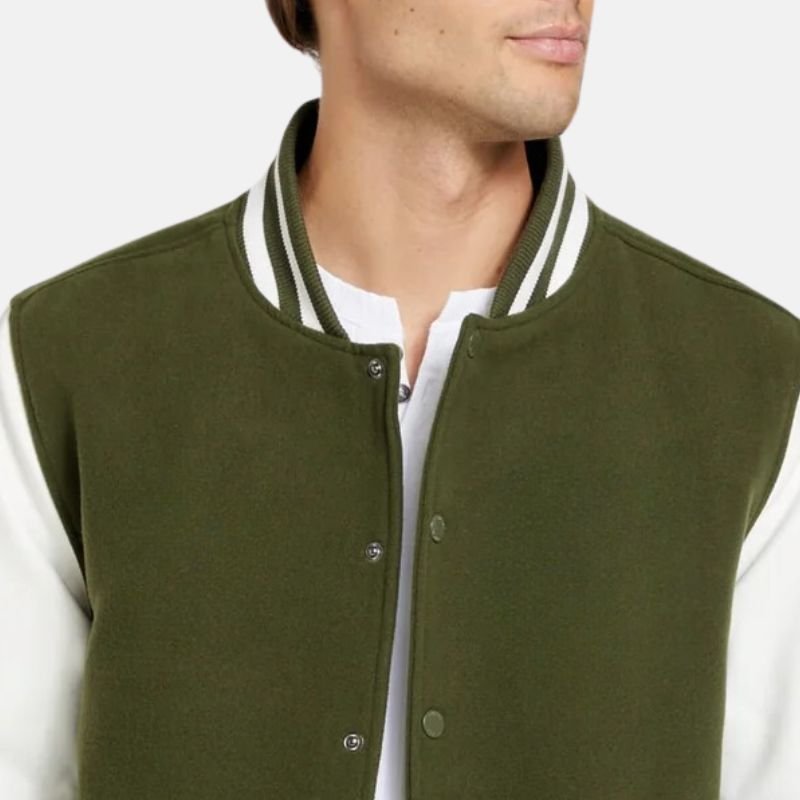 This olive green varsity jacket combines modern versatility with classic letterman styling, making it a must-have for cooler seasons. Made from 100% high-quality wool, it delivers exceptional warmth for ultimate comfort. It’s also easy on the eyes, refined enough for daily use. The soft viscose inner lining guarantees comfort for long hours, providing a smooth insulated feel against the skin. The bold white leather sleeves are a striking addition to the jacket, providing a dominant sporty edge that amplifies the classic varsity look. To tailor adaptation, this wool letterman jacket is rib knitted which provides a secure, structured feel at the cuffs and waist. This makes it easy to coordinate with a wide range of casual bottoms.