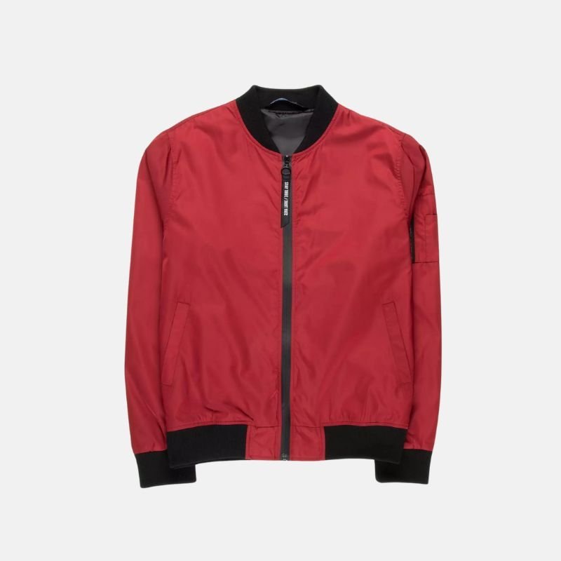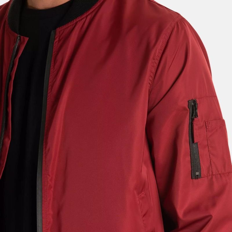 This jacket has been engineered for everyday utility. The black rib-knit cuffs trap warmth and keep the jacket contoured and structured while in motion. Full-length sleeves incorporate an extra utility pocket, adding to the genuine MA-1 look while providing more storage. There are three outer pockets for quick access to your belongings, and an inner pocket for your valuables. The smooth zipper mechanism maintains the modern look and allows the jacket to be easily fastened. The bold color and minimalistic design, along with the functional pockets and refined bomber shape, make this men’s red polyester jacket an excellent pick for casual outings, everyday wear, or traveling.