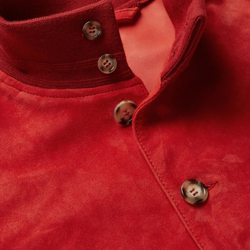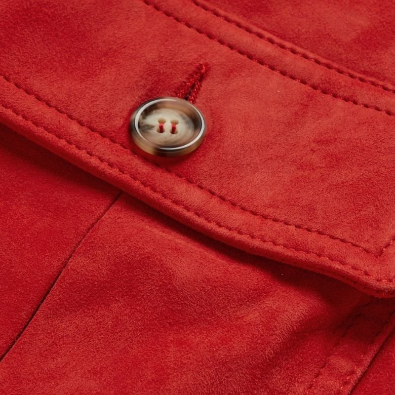 The ideal combination of practical features and aesthetic beauty has been achieved with the integration of pockets into the design. There are two large front pockets and one inner pocket, all of which blend seamlessly with the streamlined design of the jacket. The button closure allows for a well-kept appearance. This Red Suede Leather Bomber Jacket is a piece of universal staple, as it can be worn with jeans, chinos, or even dress pants. It can also be worn under a coat or as the primary piece of an ensemble. The jacket is modern and stylish, as well as self-assured. This bomber jacket is luxurious, comfortable, stylish, and an indicator of modernity all at the same time.