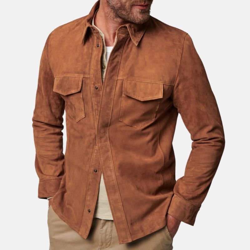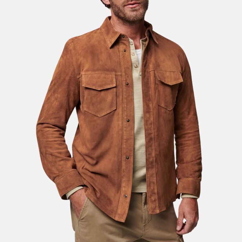 The simplicity of its shape does not take away from its utility. It has a front button closure, two front pockets, and one inner pocket to hold your valuables. It is designed to give a clean, tailored silhouette, while allowing for the efficient packing of everyday essentials. This Men’s Brown Suede Leather Jacket can easily go from a casual dinner with friends to a social gathering, making it the right pick for every occasion. It is constructed from high-quality materials and crafted with a keen eye for detail, guaranteeing that its classic look will go with almost anything for years to come. If you enjoy pieces that combine convenience and understated fashion, this suede leather shirt jacket is essential for your collection.