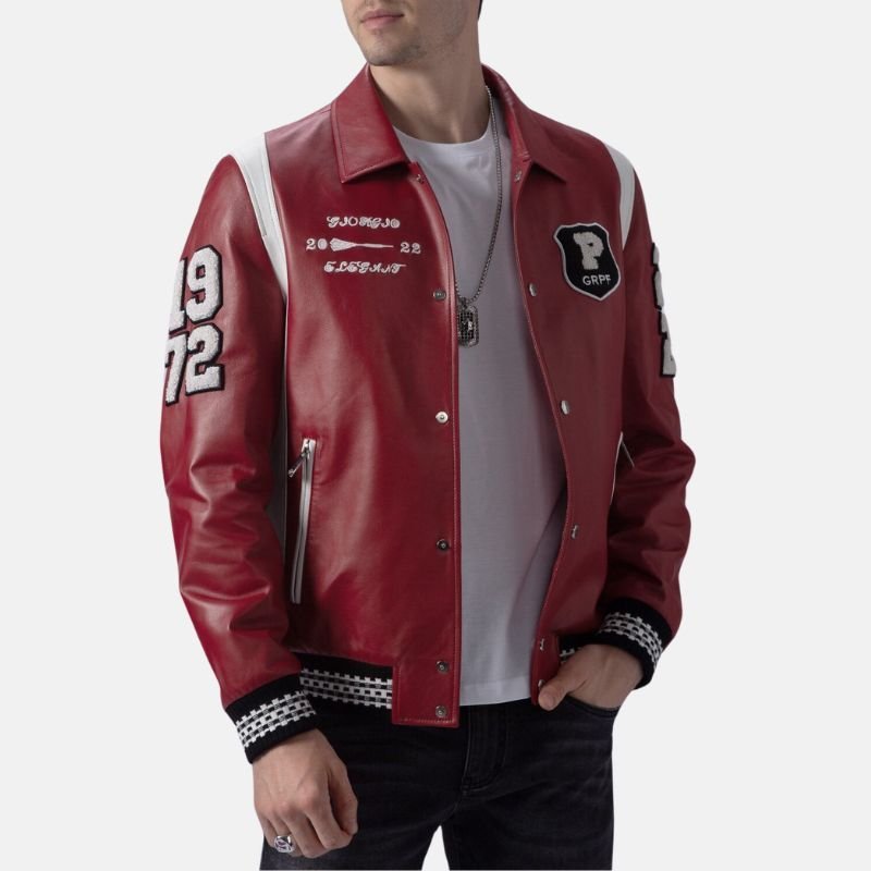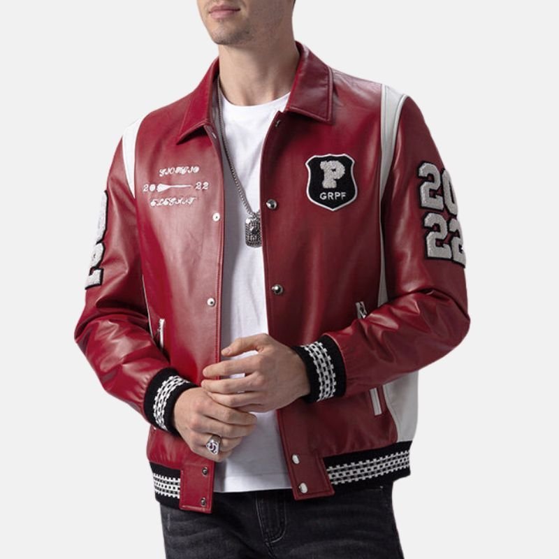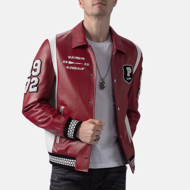 This jacket is crafted for the ideal blend of style and convenience. It can be matched easily with jeans for an easy-going style, or with chinos for something a bit more smart-casual. With the two side pockets and one inner pocket, all your storage needs can be met. It is made of strong, durable leather and designed to withstand the test of time. Being made of leather and a varsity style, this jacket is appropriate for any season. The varsity style is complemented by the bold, bright and confident red color; a hue that symbolizes energy and individuality. This varsity jacket is one of the most stylish and comfortable pieces a man can have. It provides versatility for any type of outfit.