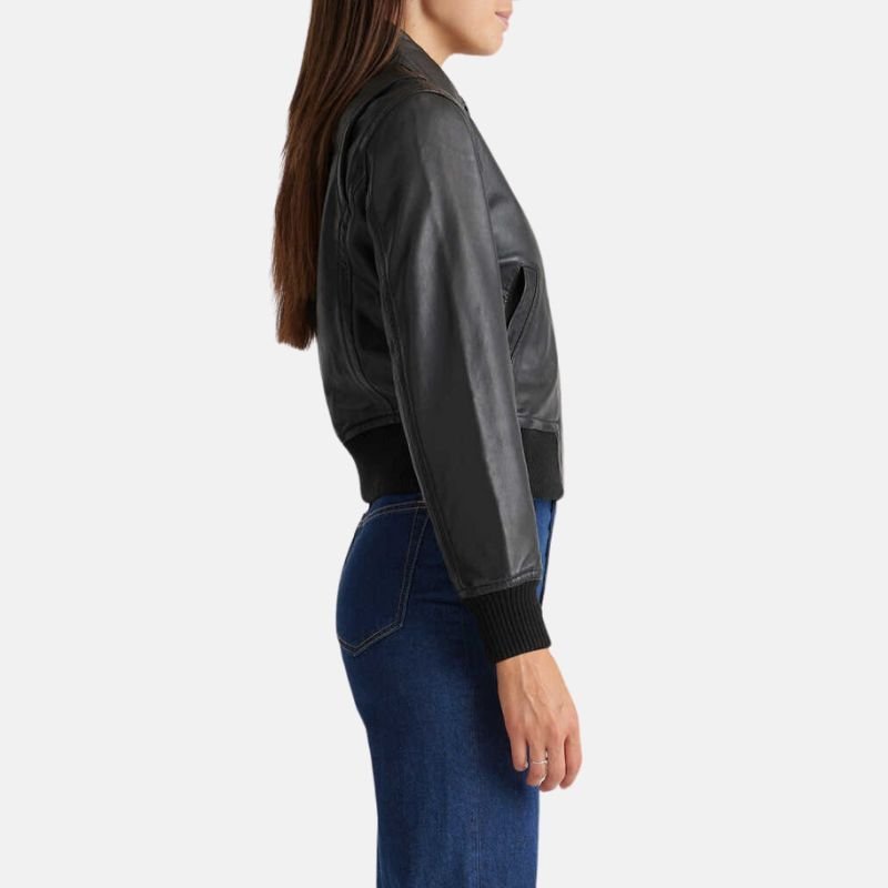 Mila Bomber Black Leather Jacket For Women.