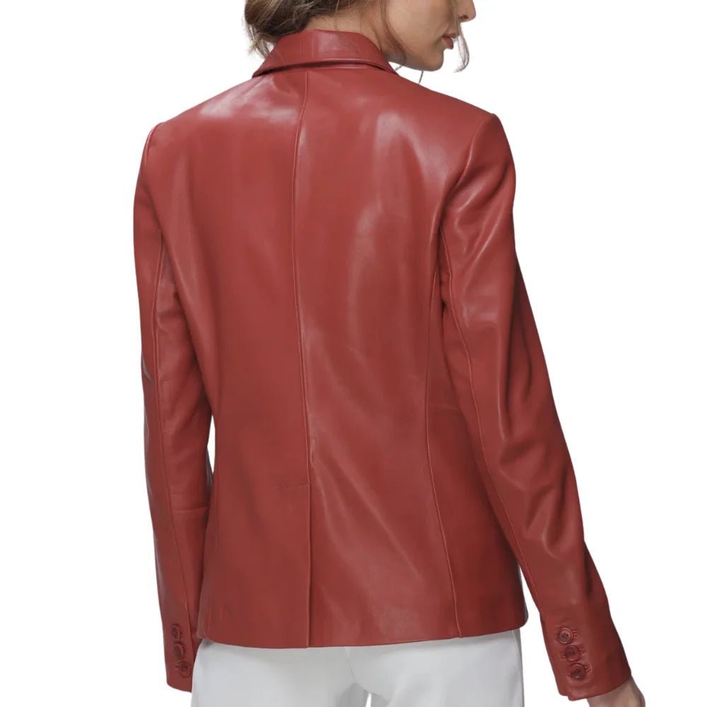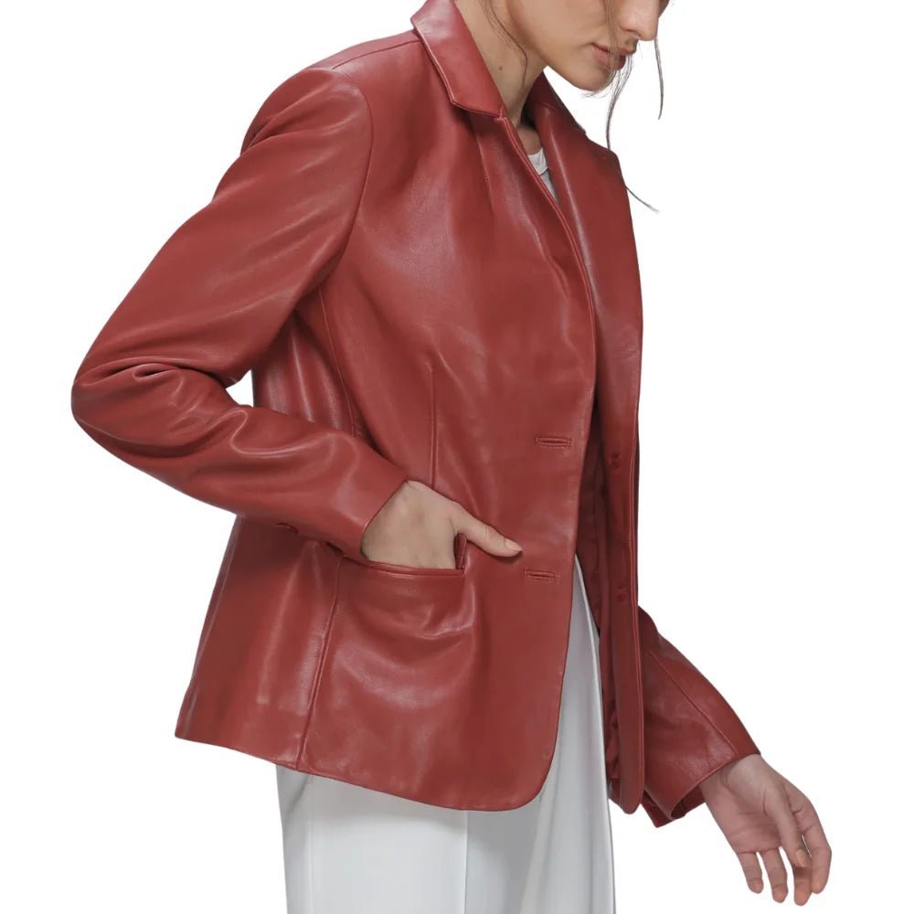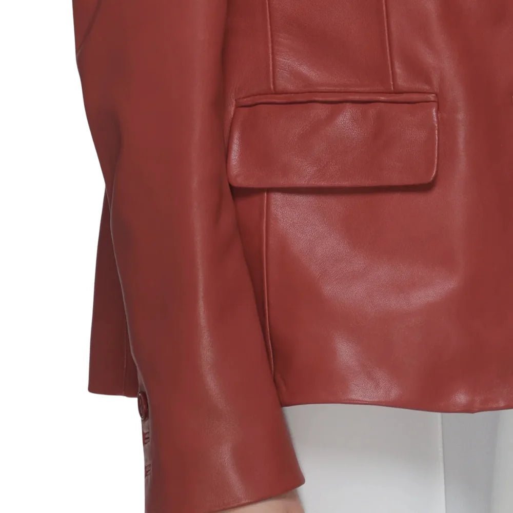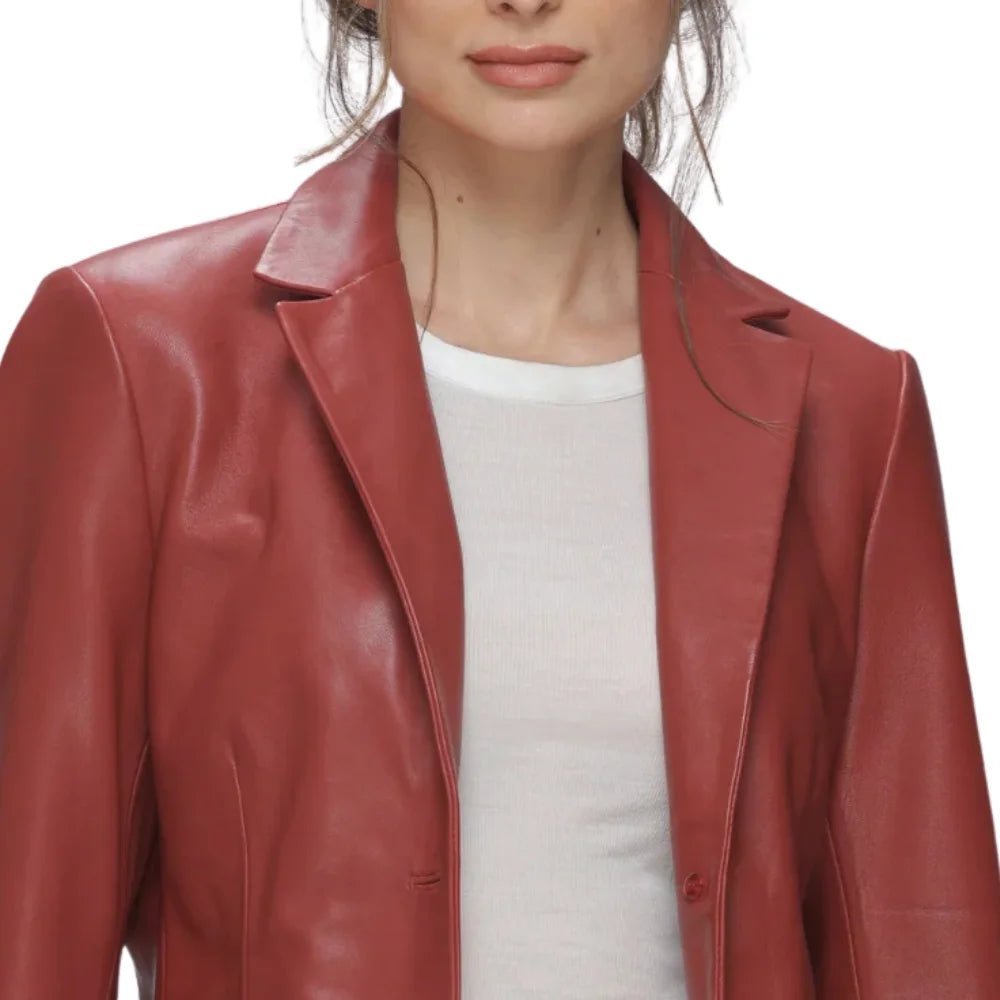 Chic Red Women’s Lambskin Leather Blazer with Modern Notch Lapel Design