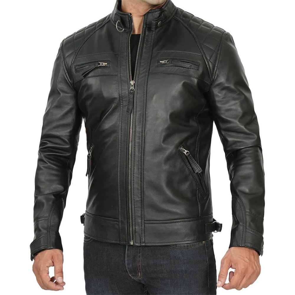 Elevate your wardrobe with the Oliver Here Oliver Men’s Quilted Black Cafe Racer Leather Jacket built for the modern man who values both style and function. Crafted from premium sheepskin, it has an elegant, confident look that blends timeless design with everyday comfort. The deep black tone pairs easily with jeans, chinos or formal wear, making it ideal for any occasion. In addition, padded shoulders add texture and depth, while the collar with press studs and strong YKK zip provides structure and strength. With four external zipped pockets and an internal pocket, it offers both practicality and sharp details.