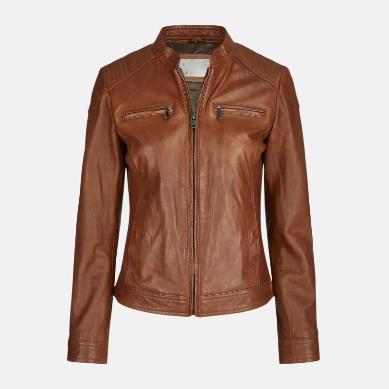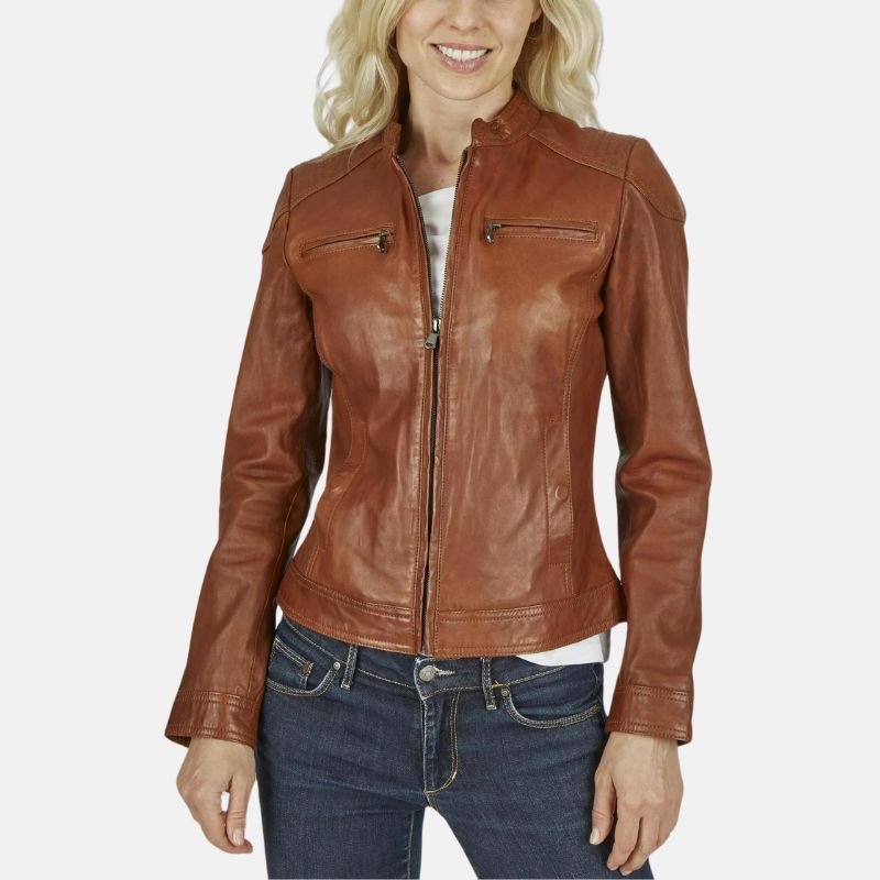 Slim Fit Motorcycle Tan Leather Jacket For Women.