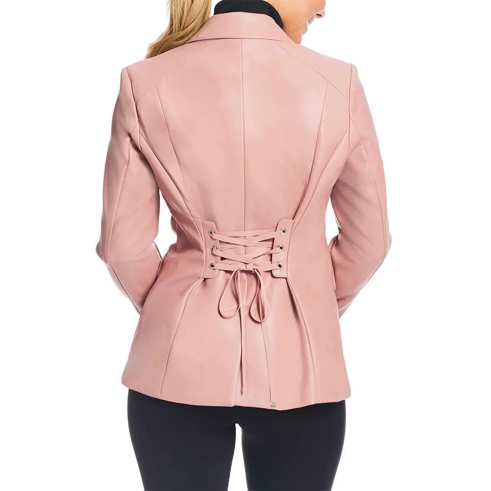 Chic Pink Women’s Leather Blazer with Notch Lapel and Flap Pockets