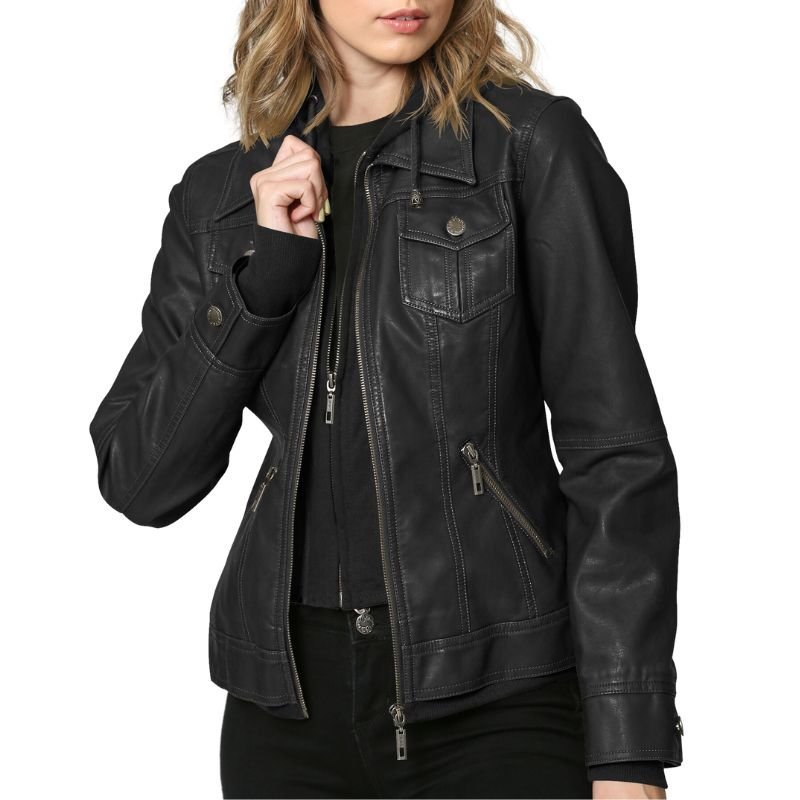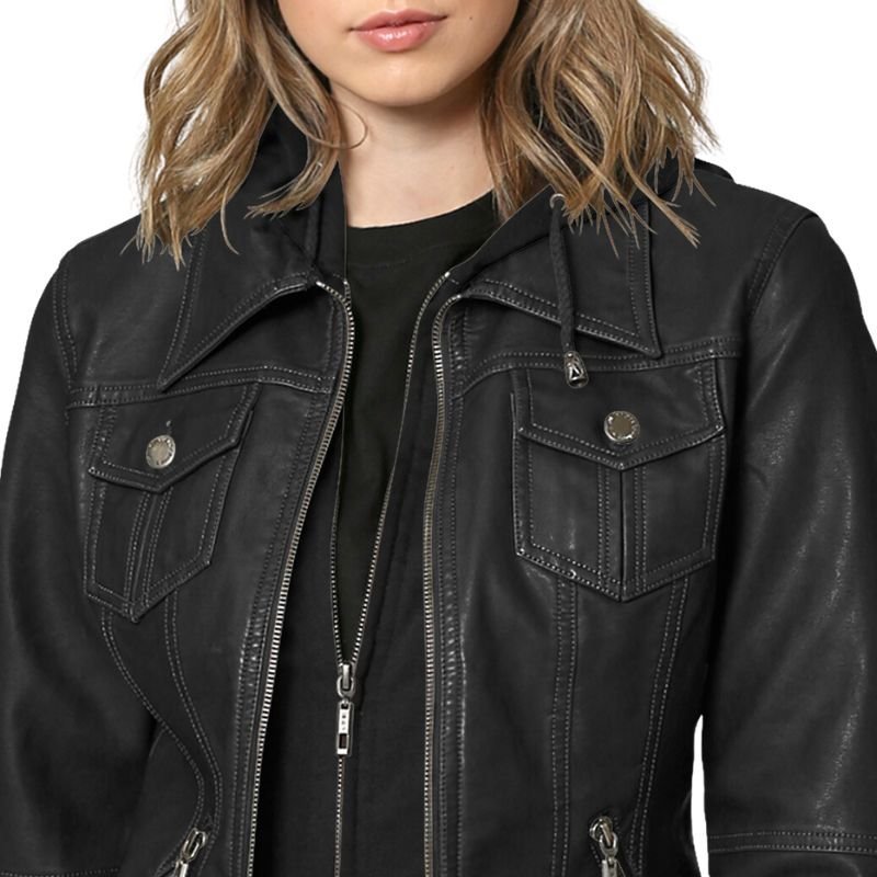 Sofia Women Black Leather Bomber Jacket with Removable Hood.