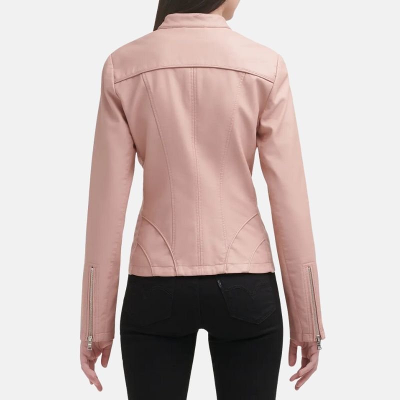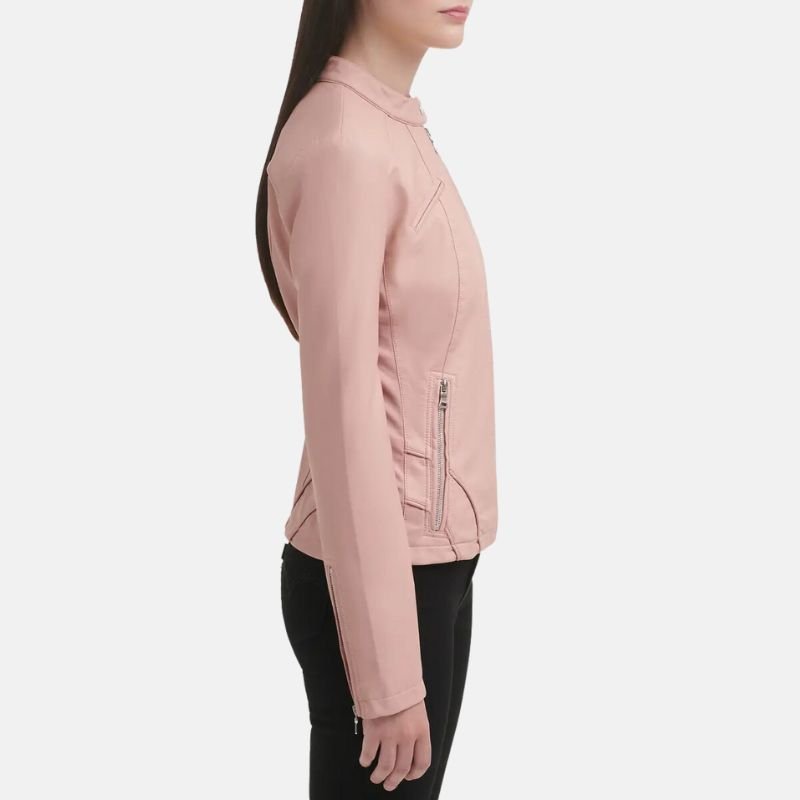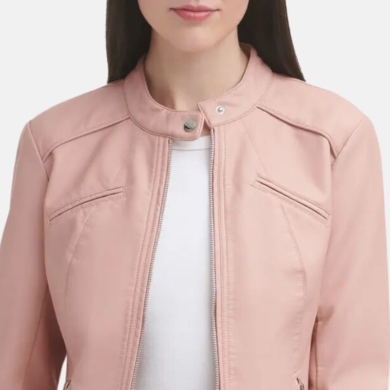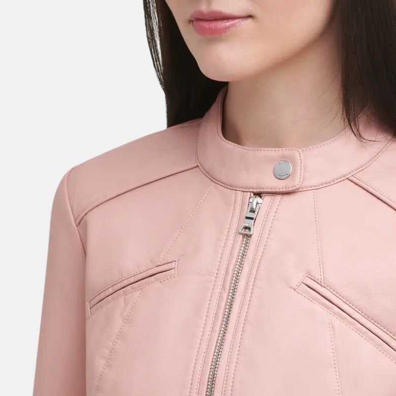 Add a soft, feminine touch to your wardrobe with the Sophia Blake Women’s Light Pink Cafe Racer Leather Jacket, for those who love a little sophistication and a little edge. This jacket was made with buttery soft, genuine leather and because of that, the touch is exquisite and will last for a long time. The little details of the snap-tab collar and the zipper will create those strong lines of structure and create a flattering silhouette. The soft viscose inner lining will only add to your comfort and keep you warm.