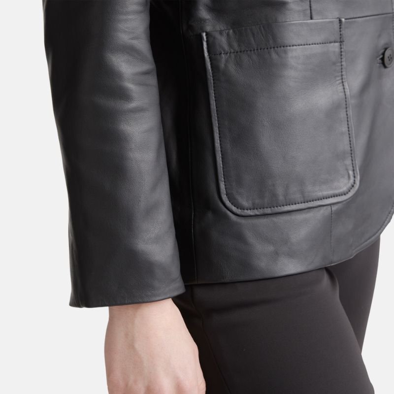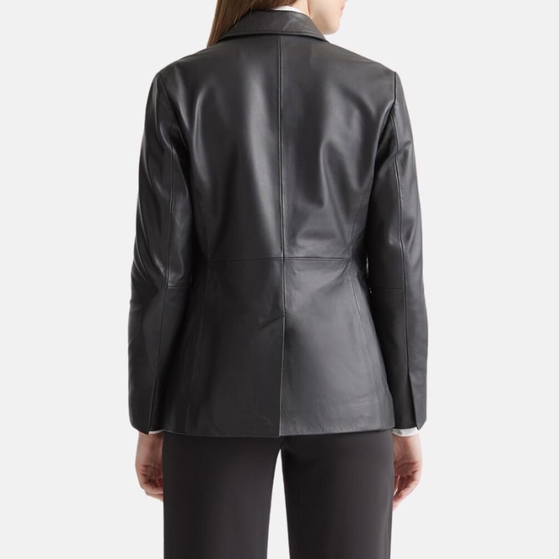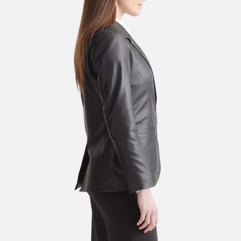 The innovative pockets show how style harmonizes with ease of movement. The design offers two outer pockets and one inner pocket which help in preserving the tidy appearance of the blazer while offering handy space to store a few belongings; like your phone, a wallet, or cards. This blazer is a lightweight and long lasting piece of black leather which will definitely become one of your numerous versatile staples. It goes well with formal pants, jeans, and even skirts. You can wear it in any setting whether it is the workplace, a casual meet, or a dressy function. This two button black leather blazer for women is sophisticated and practical. It is constructed from the finest materials and will add a classic timeless elegance to your collection. It will also enhance the comfort and movement with the high quality construction.