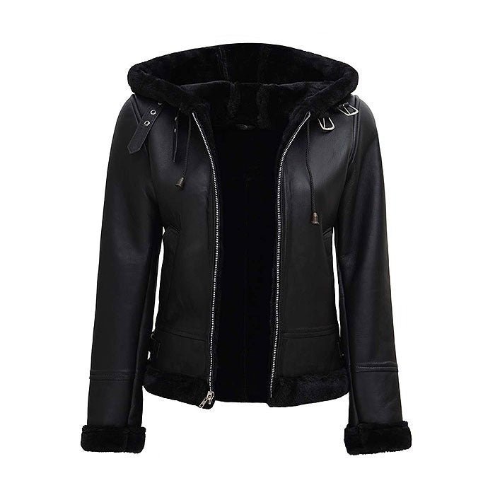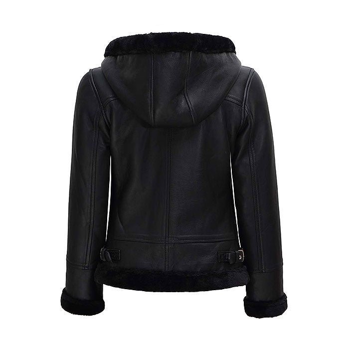 Bomber Black Aviator Jacket with Fur Hood for Womens