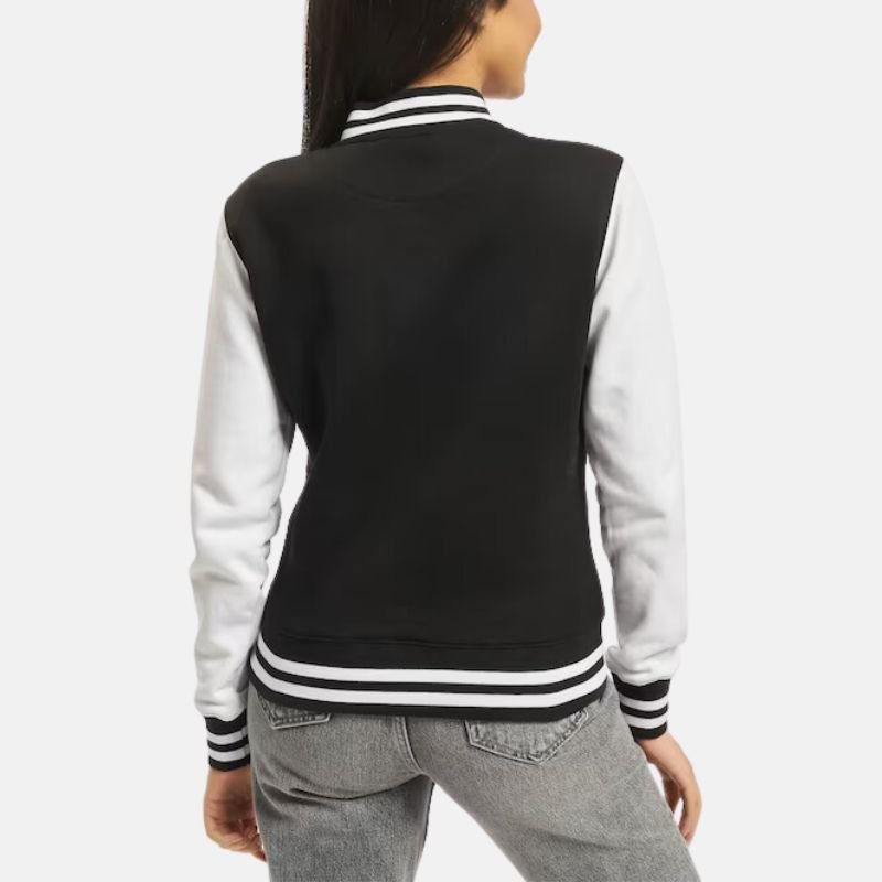 This Women’s Black and White Varsity Wool Jacket seamlessly integrates into your daily wardrobe. It’s sporty and a true blend of comfort and style. Made from quality Wool, this Wool jacket is casual, adept at withstanding use, and lightweight for daily ease. It is versatile and easy to incorporate into your other clothing choices. This Wool jacket is also easy to wear with a relaxed fit, and this makes it easier for and people of all shapes. The full, long sleeves give complete coverage, smart coverage for Wool tees, flannel shirts, or hoodies, and overall protection. Its sporty, casual, varsity style blends easily with jeans, casual skirts, or virtually any type of casual trousers, making it a versatile everyday jacket.