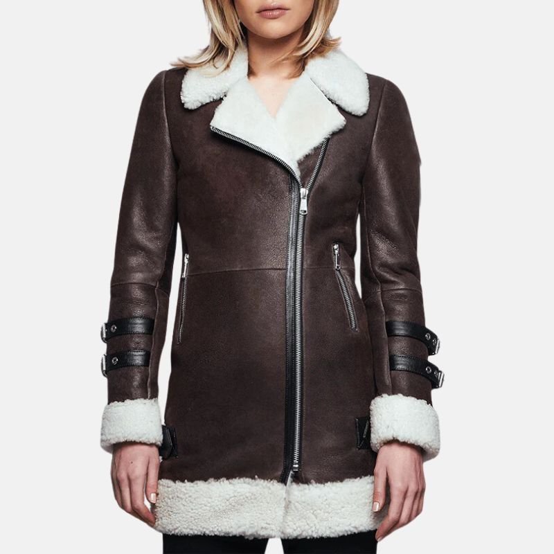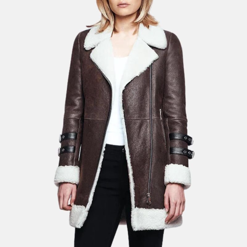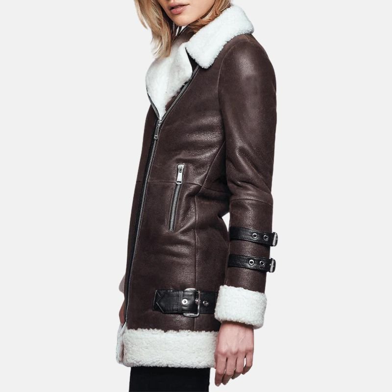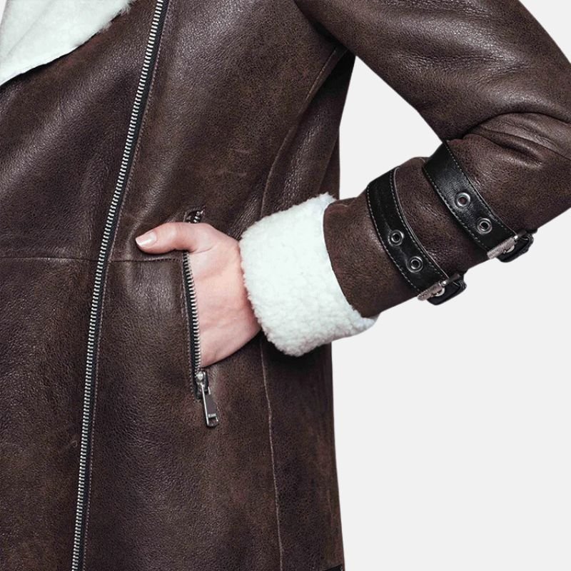 Strategically incorporated details in the design increase the functionality in everyday use. The front has a smooth zipper closure for easy attachment, and two side zipper pockets, which do not disrupt the sleek aesthetic, allow easy access to belongings. An inner pocket is included to consolidate discreet access to valuables. The cuffs are shearling-belted to provide a tailored fit and to better block cold winds, enhancing the jacket’s practicality for traveling, outdoor activities, and commutes in winter. On a relaxed day, or as part of a more polished outfit for the season, this women’s leather sherpa jacket exemplifies the perfect balance of style and functionality for winter.