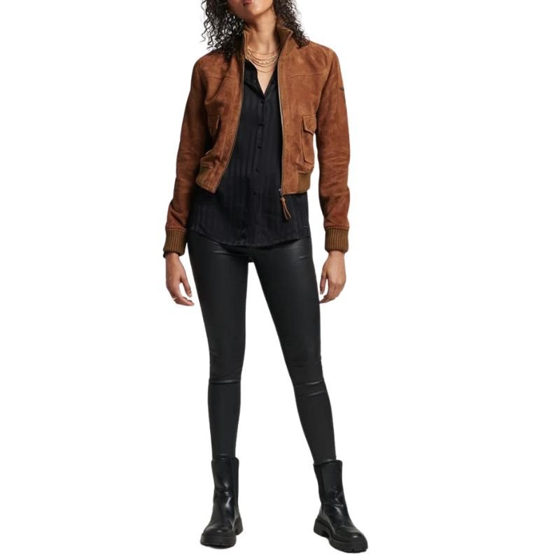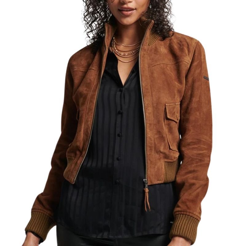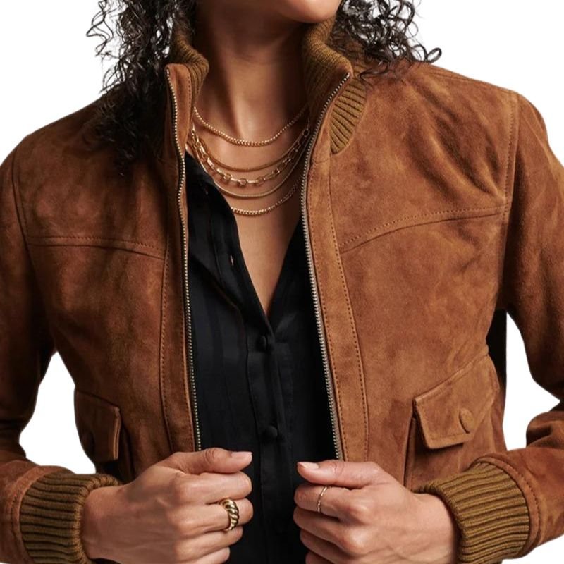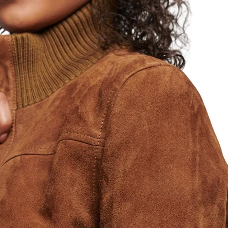 Classic Camel Suede Bomber Leather Jacket For Women