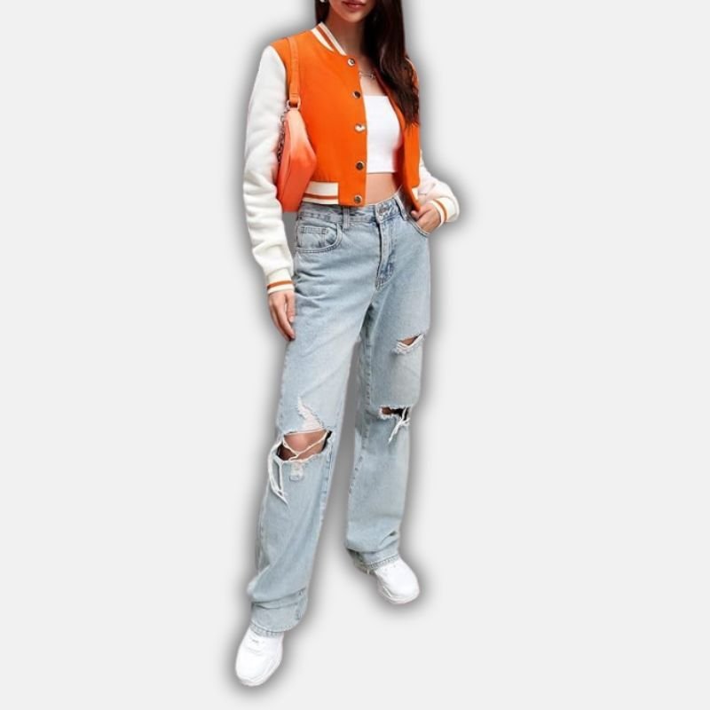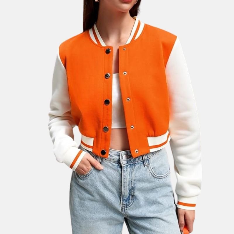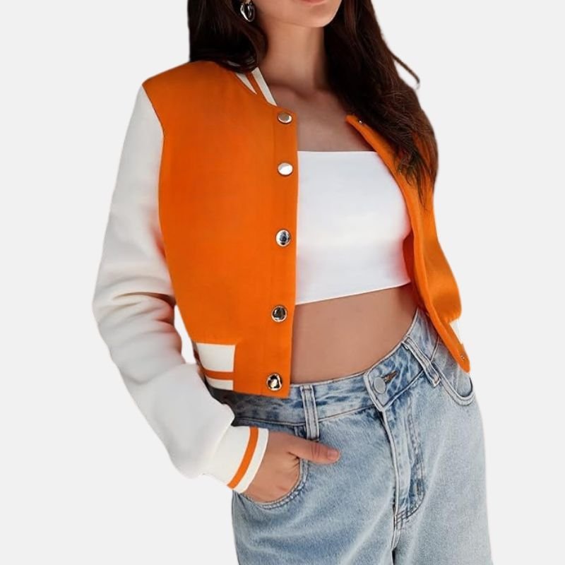 Enhance your everyday style with this Women’s Cropped Wool Orange Varsity Jacket. It’s a fashionable staple made for those who love modern style, with everyday function woven into the design. This jacket is made with premium wool and provides your body with adequate protection against the cold, and will keep the jacket looking polished for your occasions. The orange color is saturated enough for it to stand out in a crowd, perfect for those who love attention-grabbing pieces. The soft viscose lining guarantees comfort and breathability which makes the jacket perfect for different temperatures and extended wear. Keyphrases omitted, as instructed in the last statement.