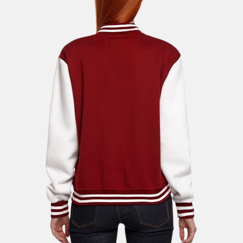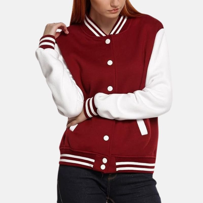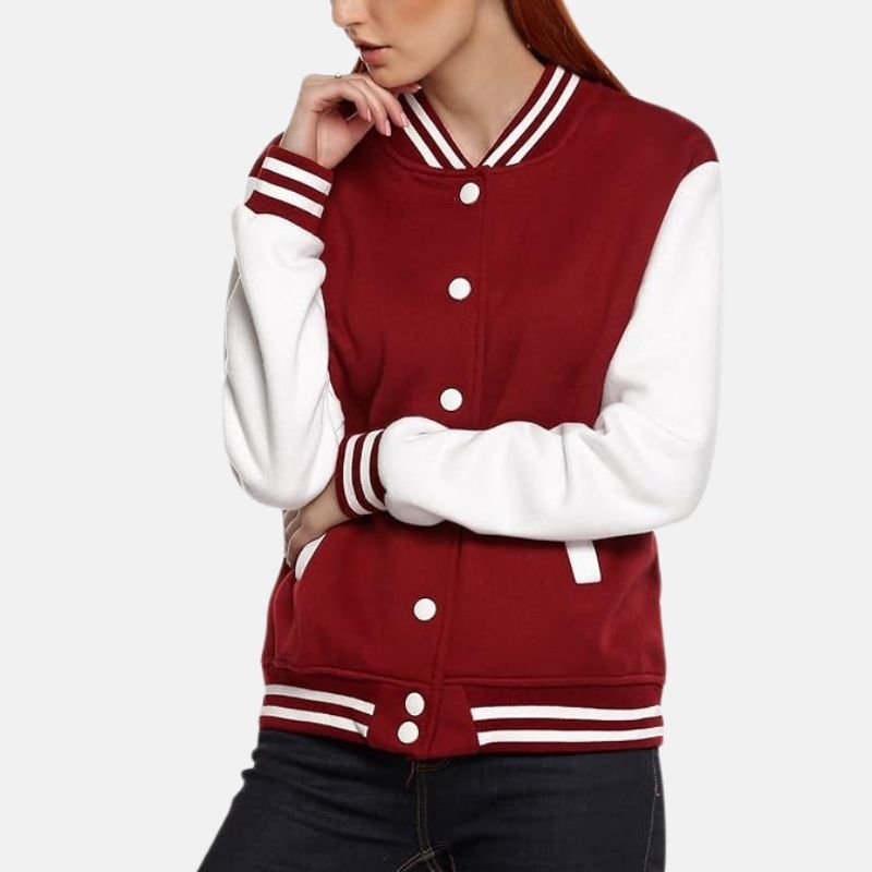 It has a classic button front closure and two side pockets for keeping hands warm or carrying small essentials. The bold red color with white accents gives it a sporty varsity appearance that pairs well with jeans, leggings, or casual pants. Designed for daily wear, college, or casual outings, this jacket combines comfort, practicality, and a versatile sporty style.