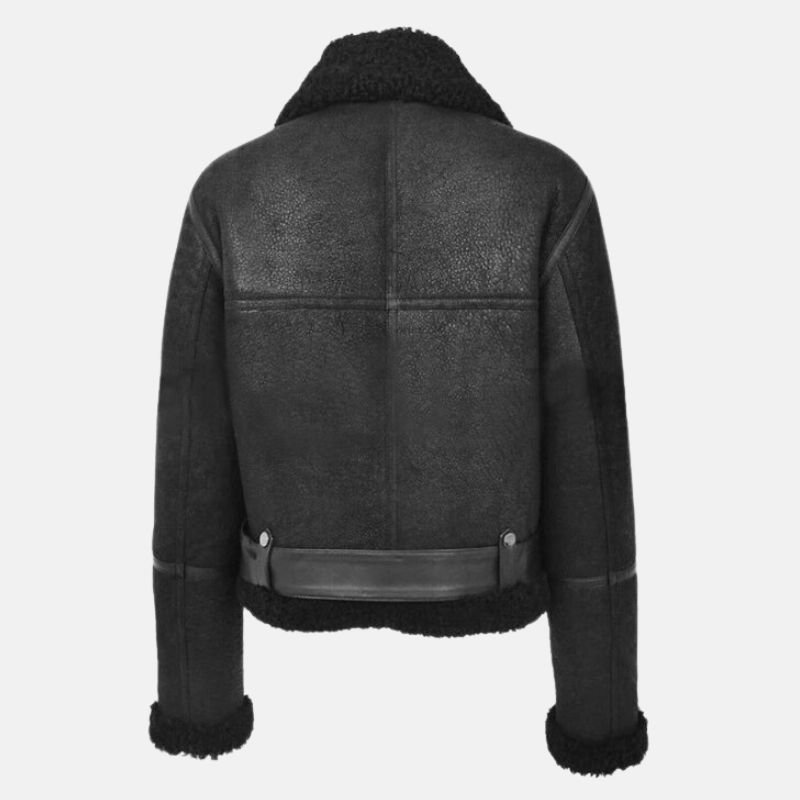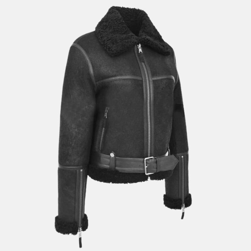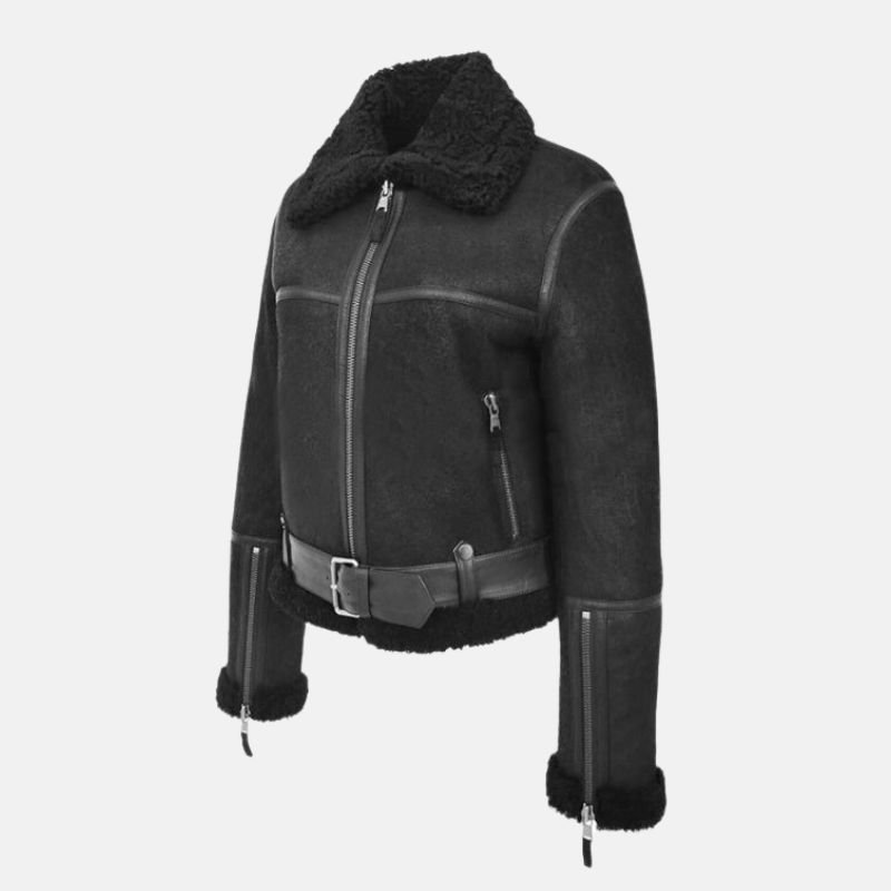 Fur Shearling Belted Black Aviator Jacket For Women’s